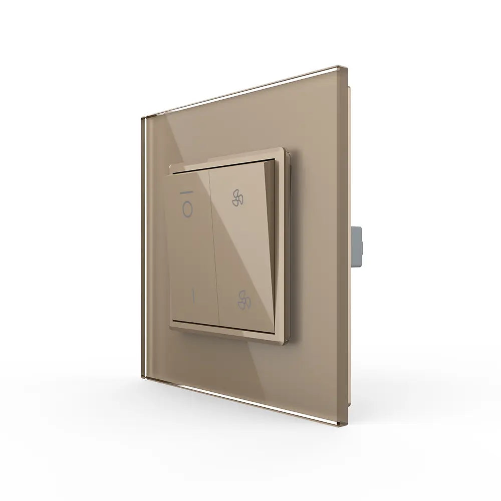 Experimente la comodidad y la apariencia refinada del completo interruptor de ventilación de 3 posiciones Livolo. Esta versión se suministra completa con un marco de cubierta de vidrio dorado y es una solución elegante y lista para usar para operar sistemas de ventilación mecánica, a menudo utilizados para ventiladores de conducto. El elegante diseño de vidrio proporciona un acabado lujoso y uniforme en la pared y encaja perfectamente en interiores modernos.