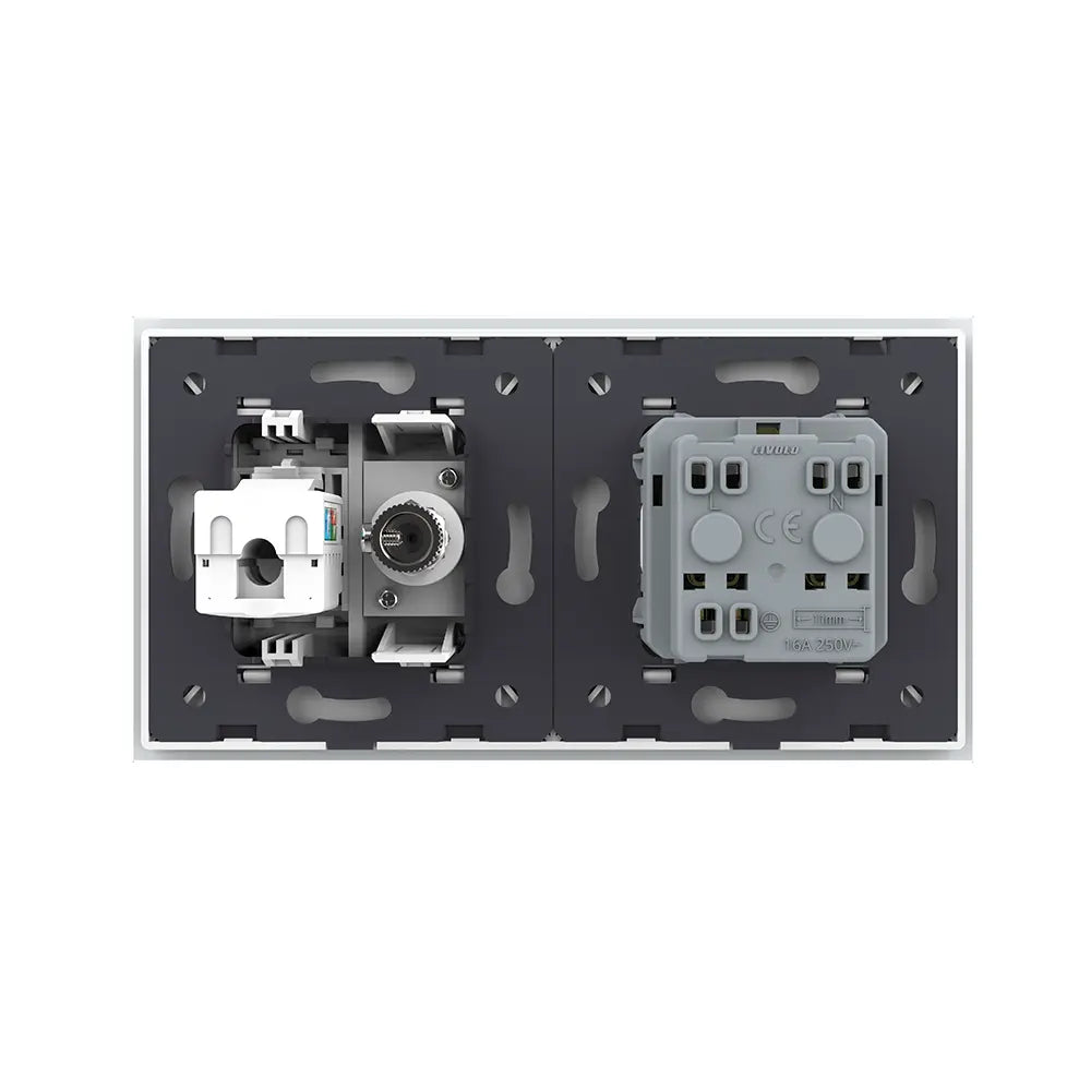 Como está acostumbrado desde Livolo, esta conexión de red y la conexión de TV coaxial se ajustan perfectamente dentro del sistema modular con cubiertos de vidrio. De esta manera, crea un aspecto elegante junto con otros interruptores o enchufes de pared. El resultado: un aspecto ordenado y lujoso entero, sin cables visibles o piezas sueltas.