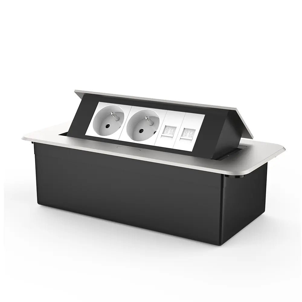 Gracias a la tapa de flexión inteligente, esta instalación de enchufes emergentes siempre está al alcance cuando la necesita, y fuera de la vista cuando no está en uso. La tapa no solo protege contra el polvo y la suciedad, sino que también evita toques no deseados, de modo que sus puntos de potencia siempre permanezcan seguros y limpios.