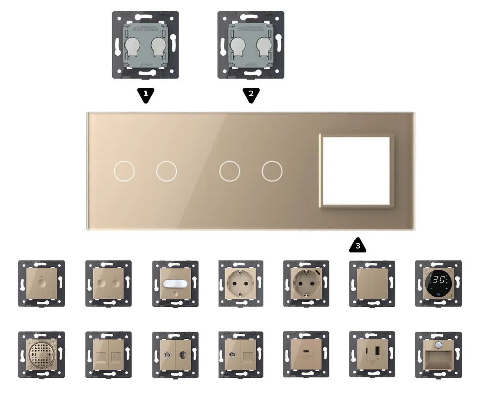 Tämän kätevän online -konfiguraattorin avulla voit vaivattomasti koota oman livolo -kytkimen. Tällä tuotesivulla voit helposti valita halutun kansi -ikkunan värin, vastaavat moduulit ja haluttaessa sijainnin tai tilan, johon kytkin on sijoitettu. Tämä mahdollistaa täysin koordinoidun ratkaisun luomisen, joka sopii täydellisesti sisätilojen ja käytännön asettelun kanssa.