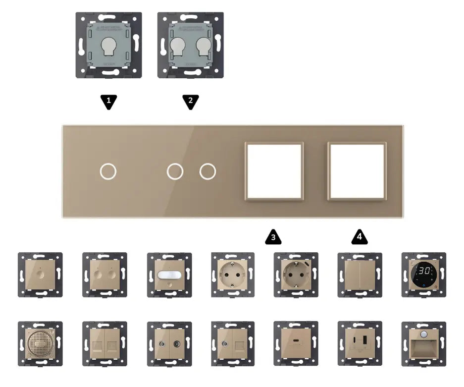 Tämän kätevän online -konfiguraattorin avulla voit vaivattomasti koota oman livolo -kytkimen. Tällä tuotesivulla voit helposti valita halutun kansi -ikkunan värin, vastaavat moduulit ja haluttaessa sijainnin tai tilan, johon kytkin on sijoitettu. Tämä mahdollistaa täysin koordinoidun ratkaisun luomisen, joka sopii täydellisesti sisätilojen ja käytännön asettelun kanssa.