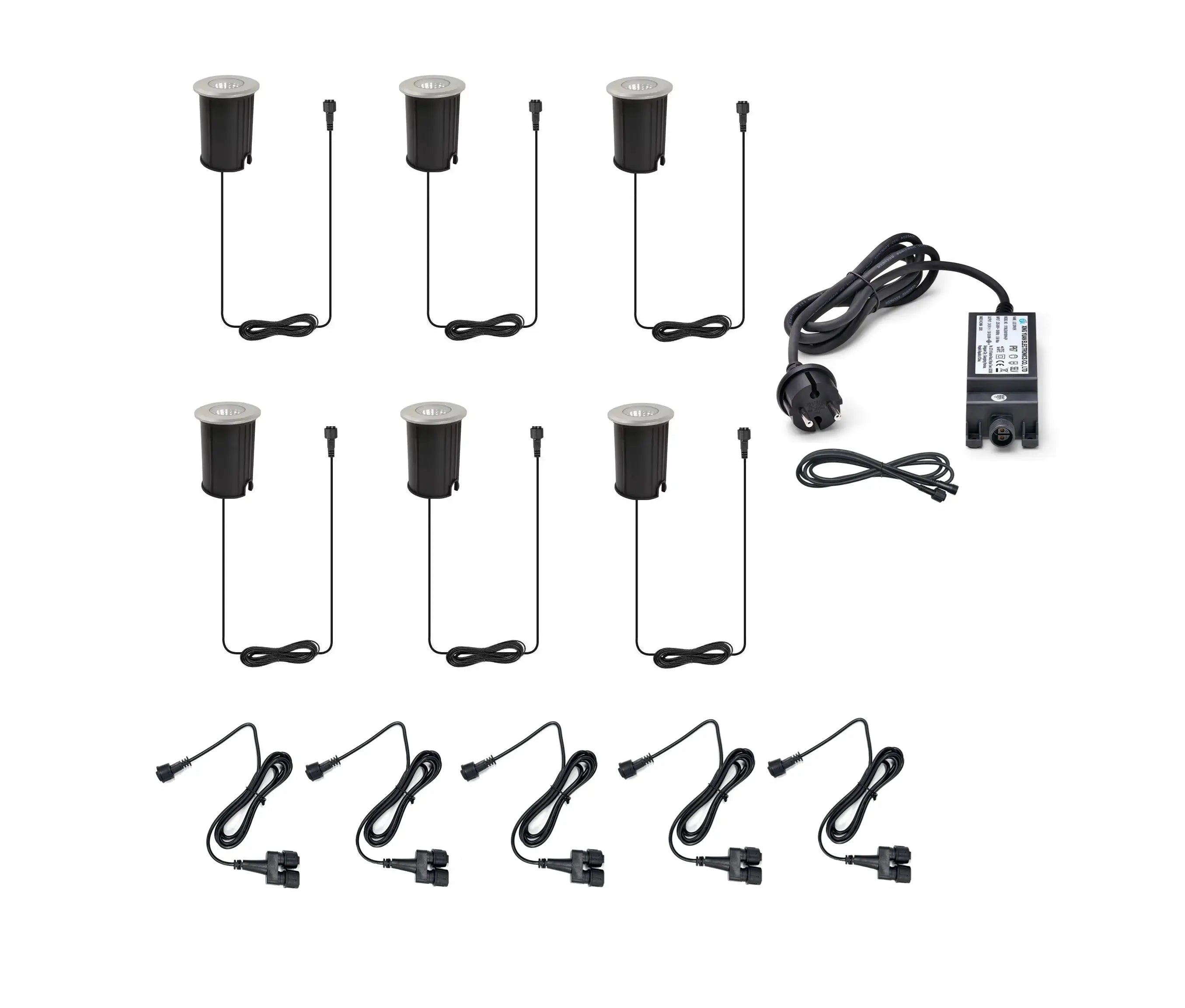 Deze compacte grondspot set van 6 met een diameter van slechts 42 mm is ideaal voor wie zijn tuin subtiel maar effectief wil verlichten. Dankzij het kleine formaat vallen de spots nauwelijks op in het gazon, terras of langs een tuinpad, terwijl ze toch zorgen voor een sfeervol lichteffect. De spots worden geleverd met 5 meter lange kabels met adapter en is onderdeel van het plug & play systeem, waardoor aansluiten snel en eenvoudig gaat.