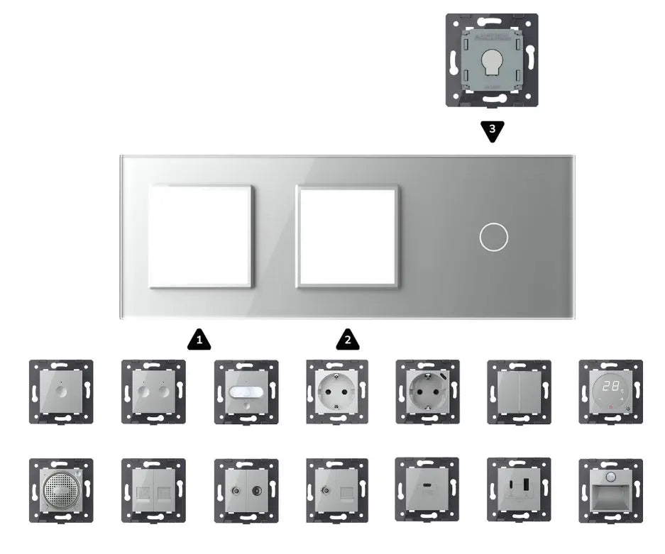 Avec ce configurateur en ligne pratique, vous pouvez mettre en place sans effort votre propre commutateur Livolo. Sur cette page de produit, vous pouvez facilement choisir la couleur de la fenêtre de couverture souhaitée, les modules correspondants et, si vous le souhaitez, un emplacement ou un espace où le commutateur est placé. Cela permet de créer une solution entièrement coordonnée qui correspond parfaitement à votre intérieur et à votre disposition pratique.