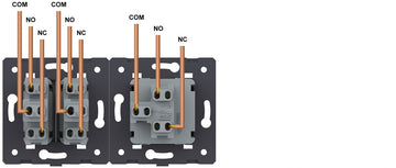 Le commutateur WIP Livolo Puls a trois points de connexion: com, no et nc. Ceux-ci permettent d'intégrer le commutateur de différentes manières dans les systèmes électriques ou domestiques: