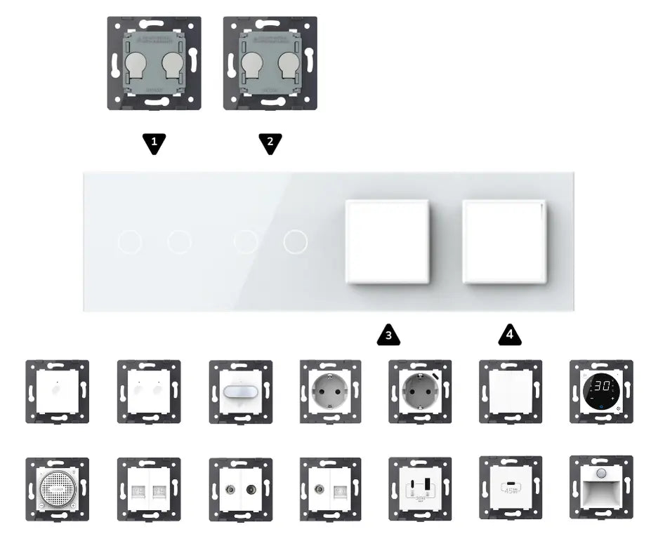 Sia che tu abbia bisogno di un interruttore o desideri una casa completa con materiale di commutazione moderno, con questo sistema puoi mettere insieme il tuo interruttore perfetto, completamente e chiaramente, completamente su misura per i tuoi desideri e la tua casa.