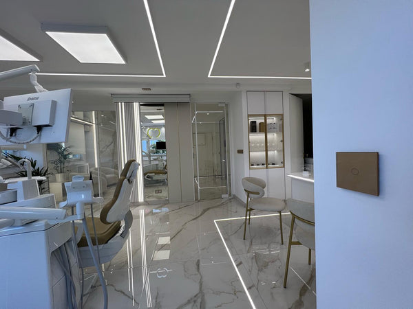 In questo studio dentistico, gli interruttori touch dorati e le prese a parete sono un'aggiunta perfetta al design elegante e professionale.