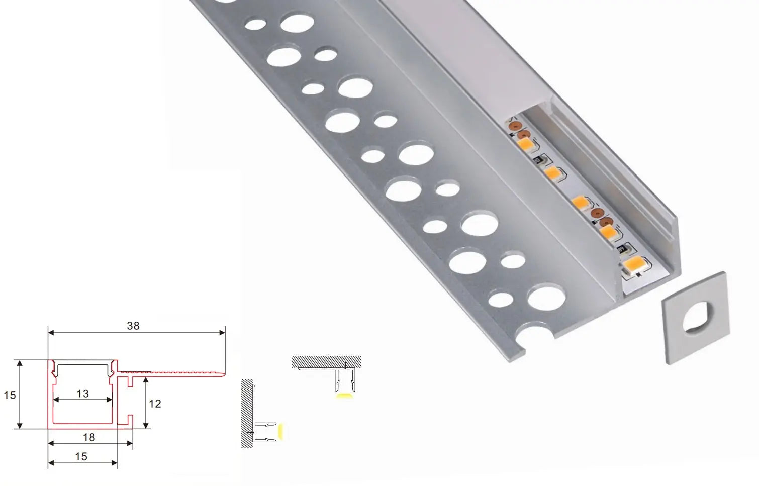 Het aluminium profiel is speciaal ontworpen voor inbouw in pleisterwerk (stuc) of achter wand- of vloertegels. Hierdoor wordt de verlichting naadloos weggewerkt en blijft enkel het zachte licht zichtbaar. Een ideale keuze voor wie een stijlvol en hoogwaardige lichtoplossing zoekt zonder zichtbare armaturen. Perfect voor indirecte verlichting, accentverlichting of het creëren van een architectonisch lichteffect.
