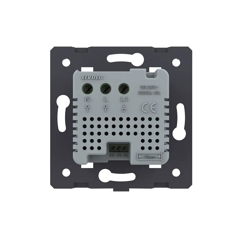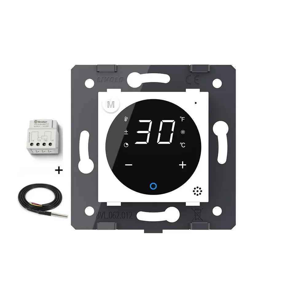 Livolo-termostaten levereras med en kompakt mini-relay, som bildar anslutningen mellan termostaten och din centralvärmepanna. Termostaten fungerar på 230V elnätkraft och styr mini-relay, som sedan byter centralvärmepannan via dubbeltrådanslutningen. Dessutom levereras en 5 -meter -långa golvsensor som standard, som placeras i ett rör tillsammans med golvvärme för en optimal temperaturmätning.